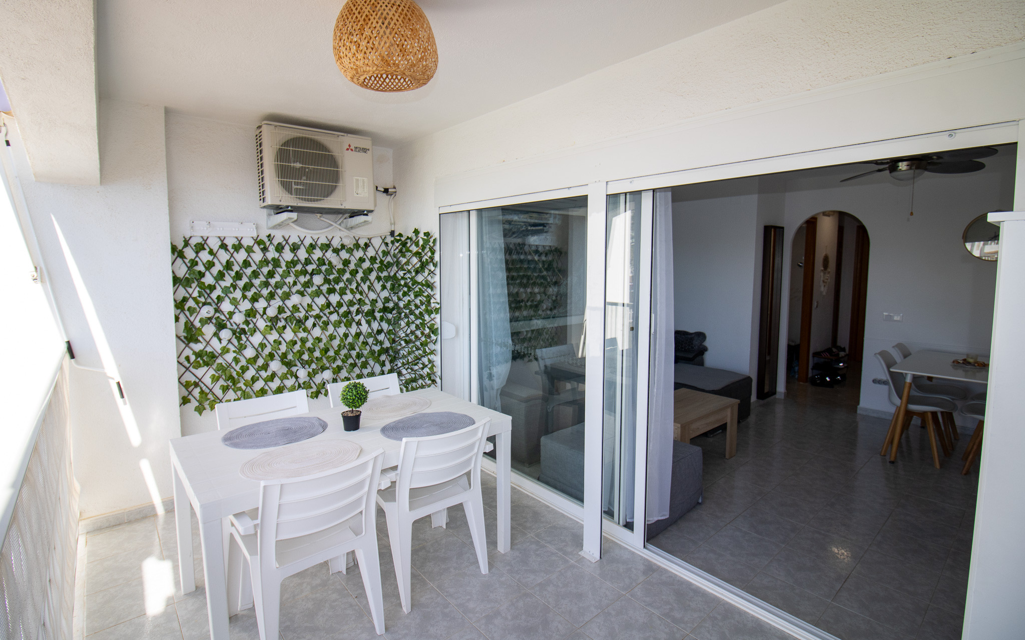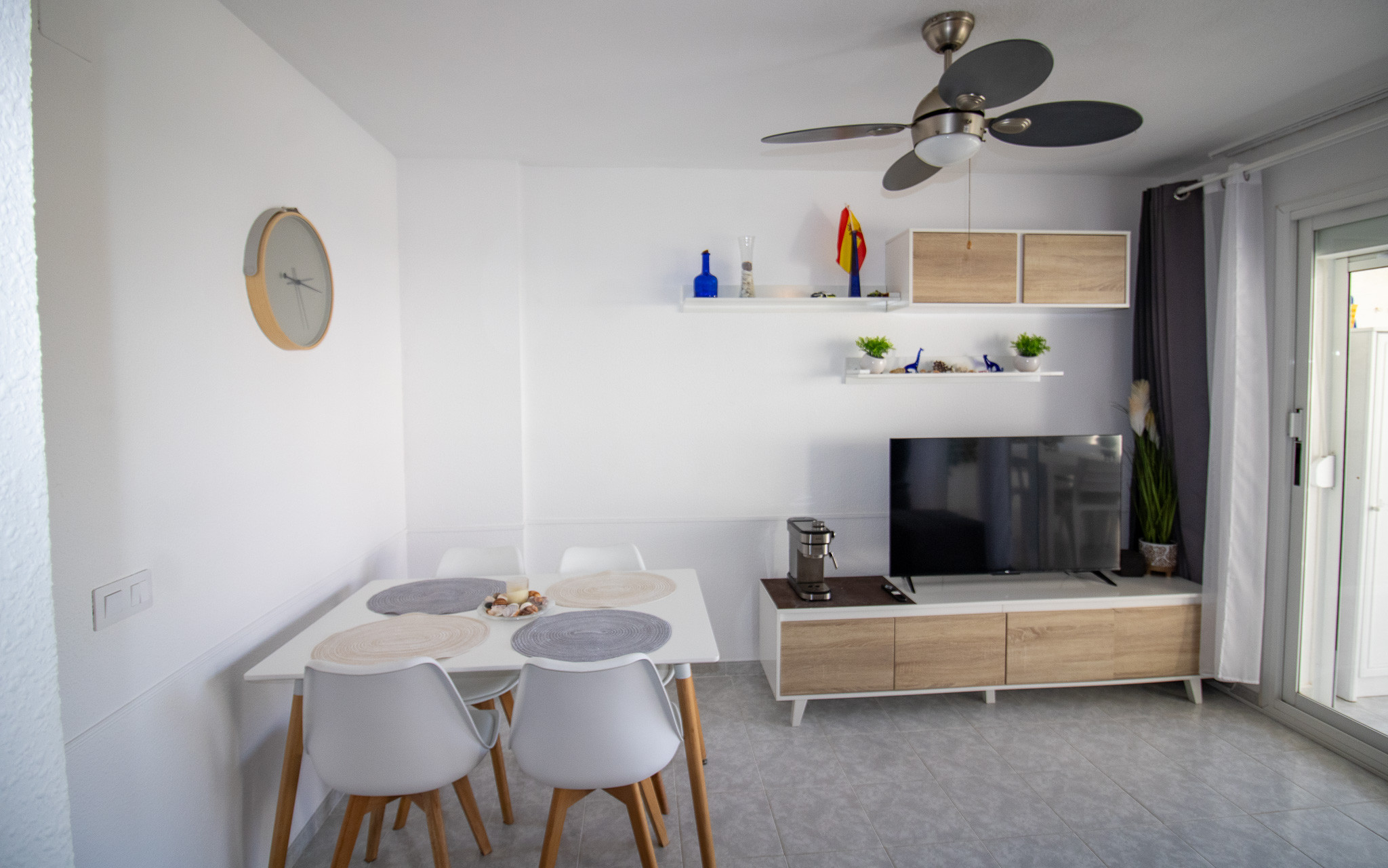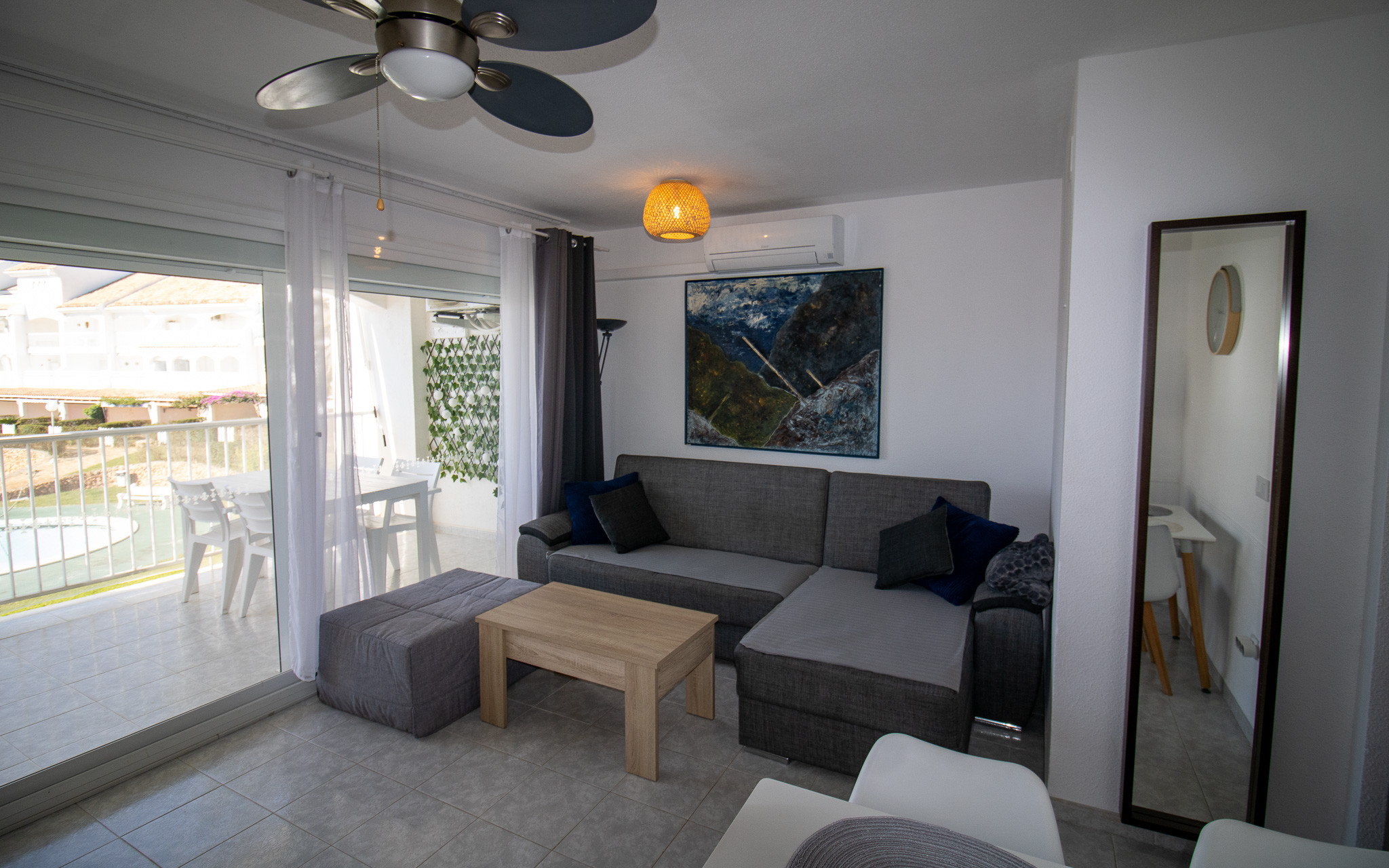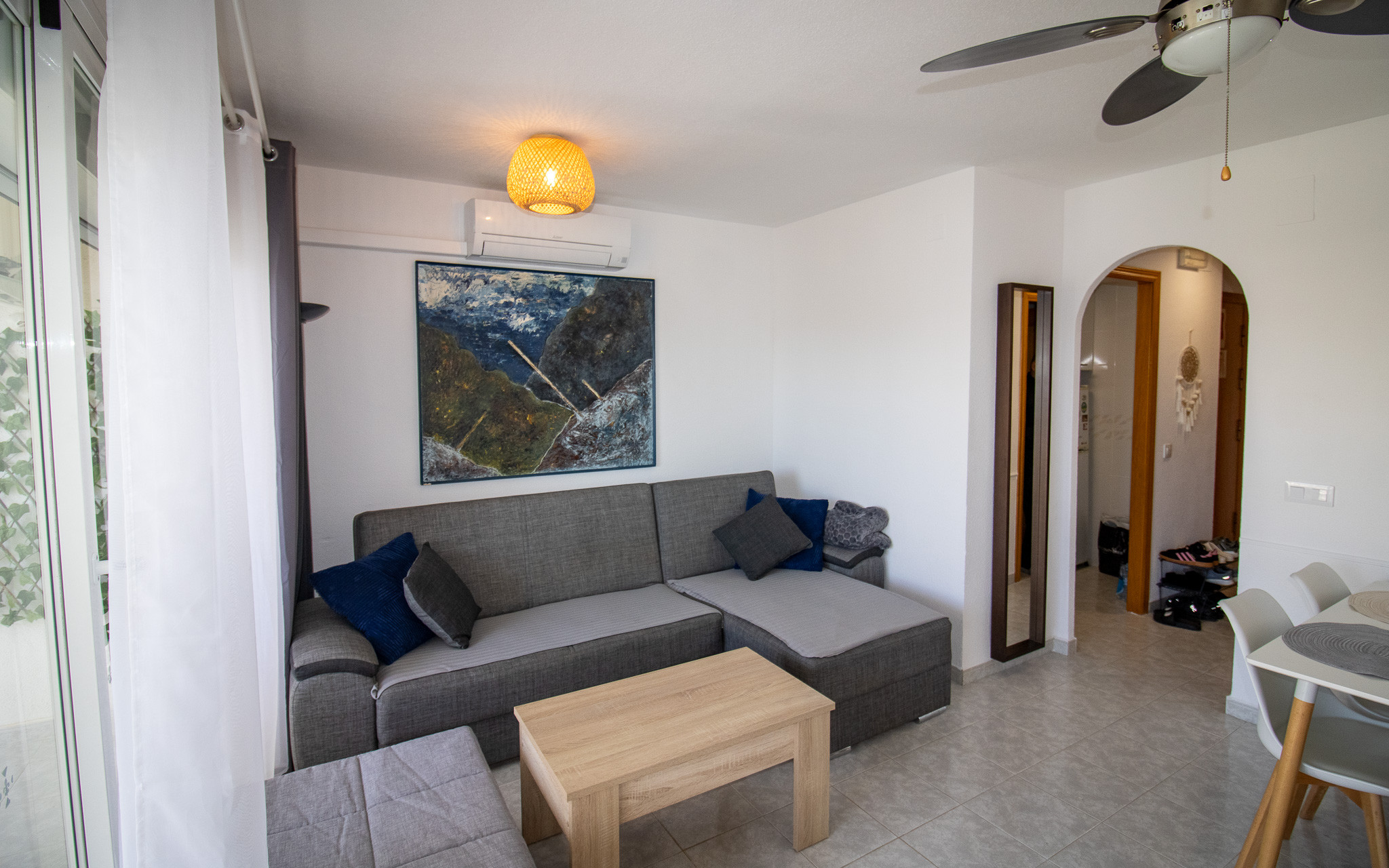 Dispone de lavadora, calefacción bomba de calor, aire acondicionado solo en salón, piscina comunitaria+infantil, 1 ventilador, 1 Televisor.