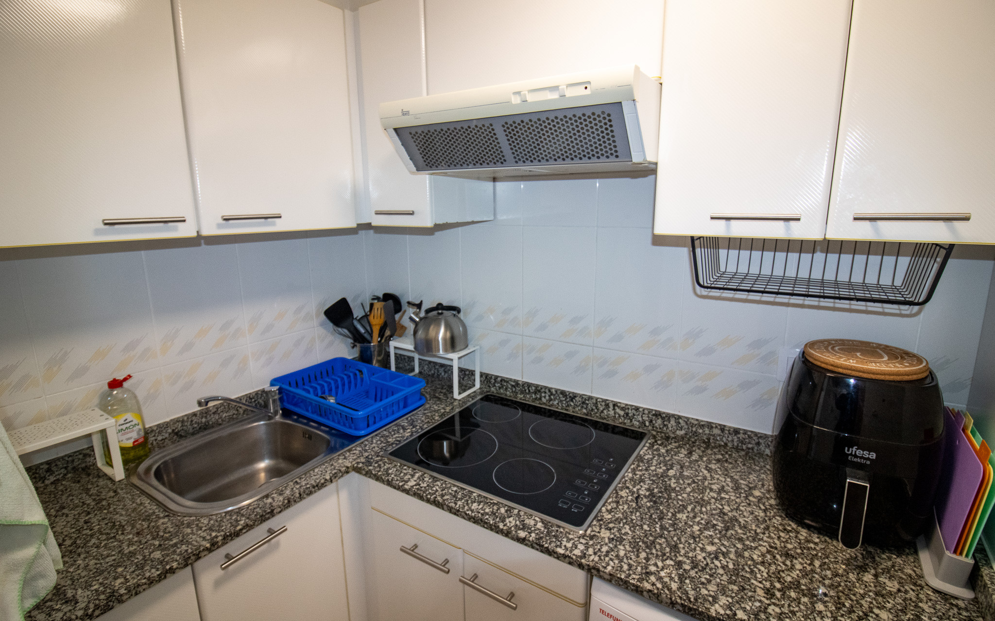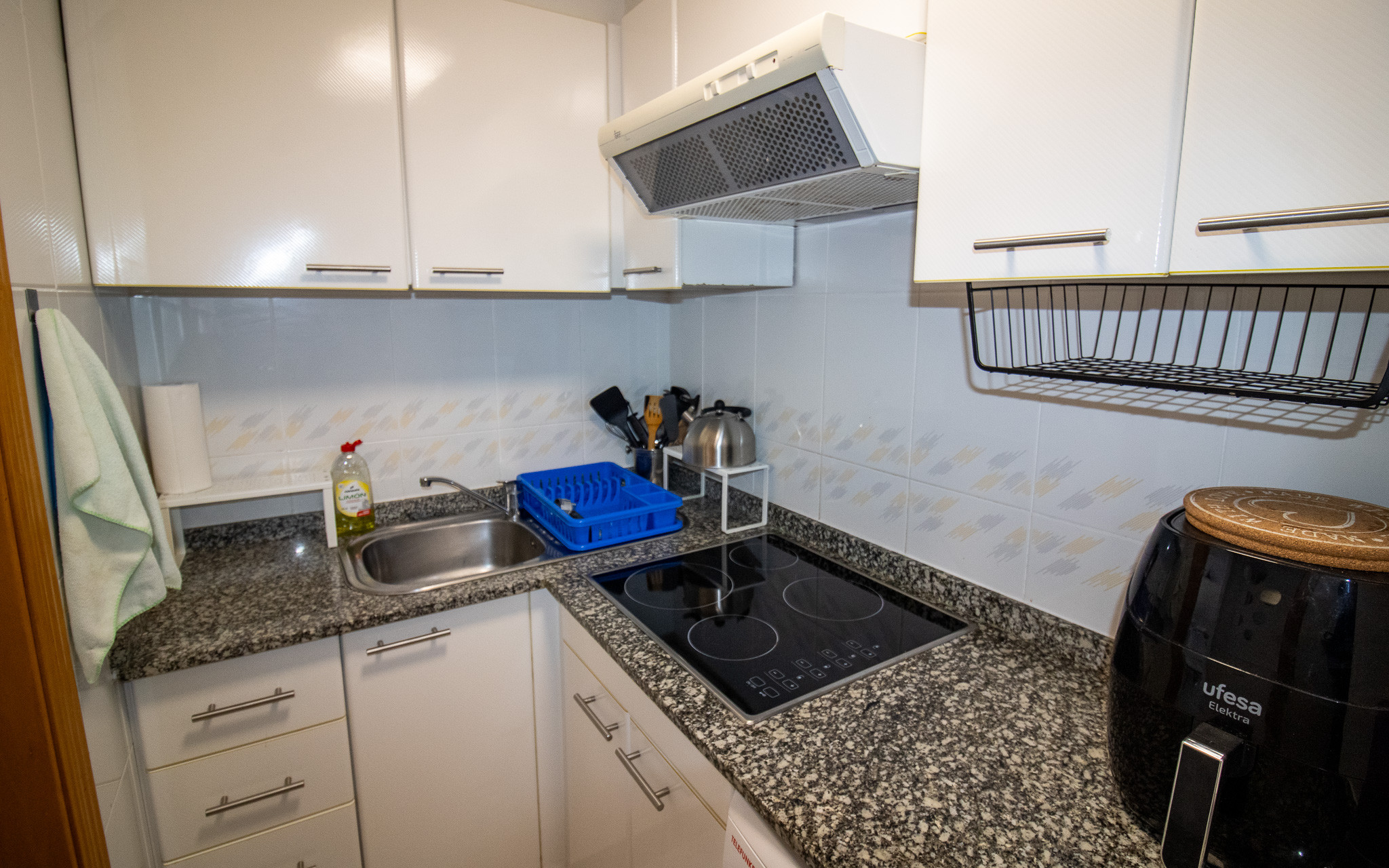 La cocina americana, de vitrocerámica, está equipada con nevera, microondas, horno, congelador, lavadora, utensilios/cocina, cafetera y tostadora.
