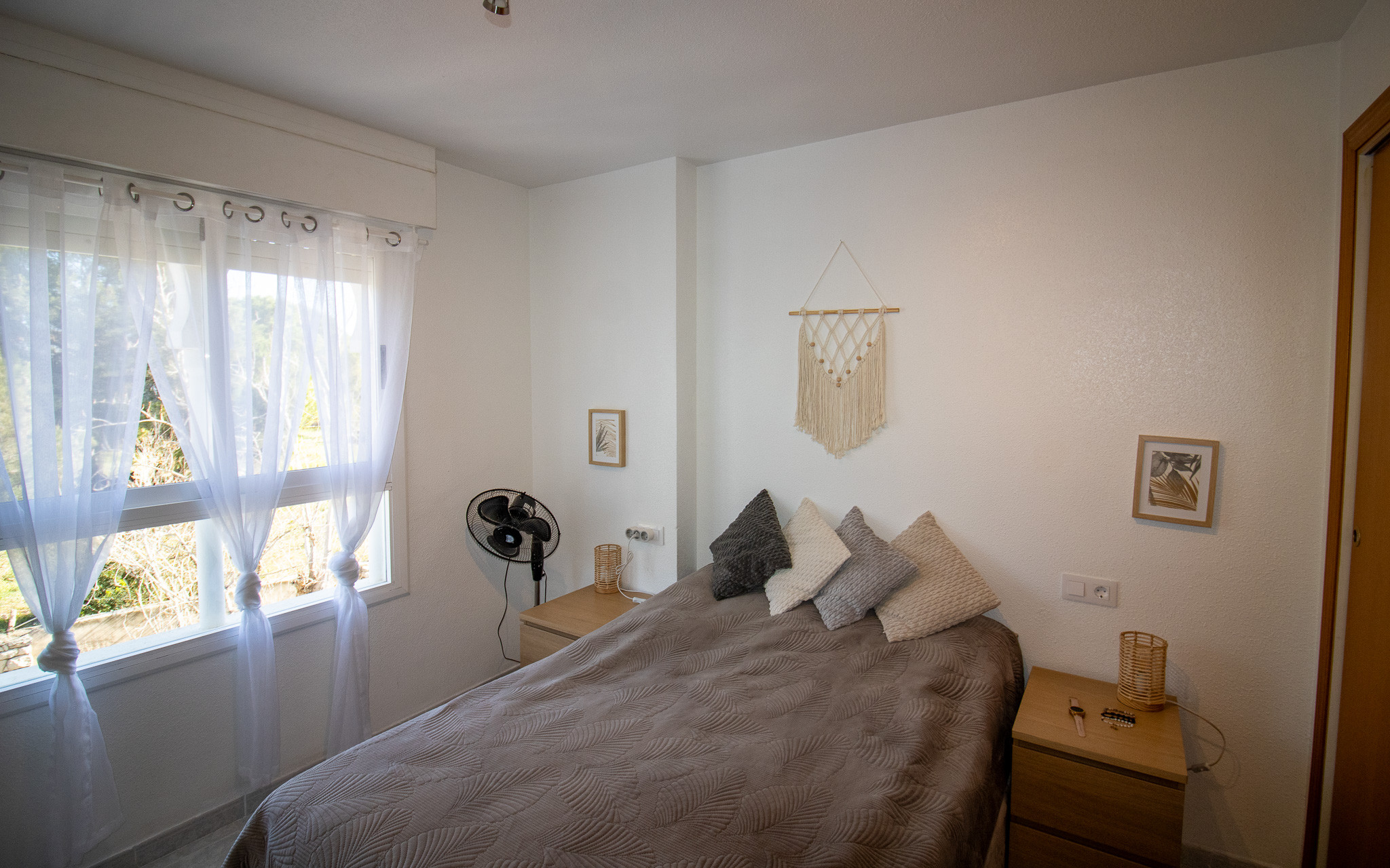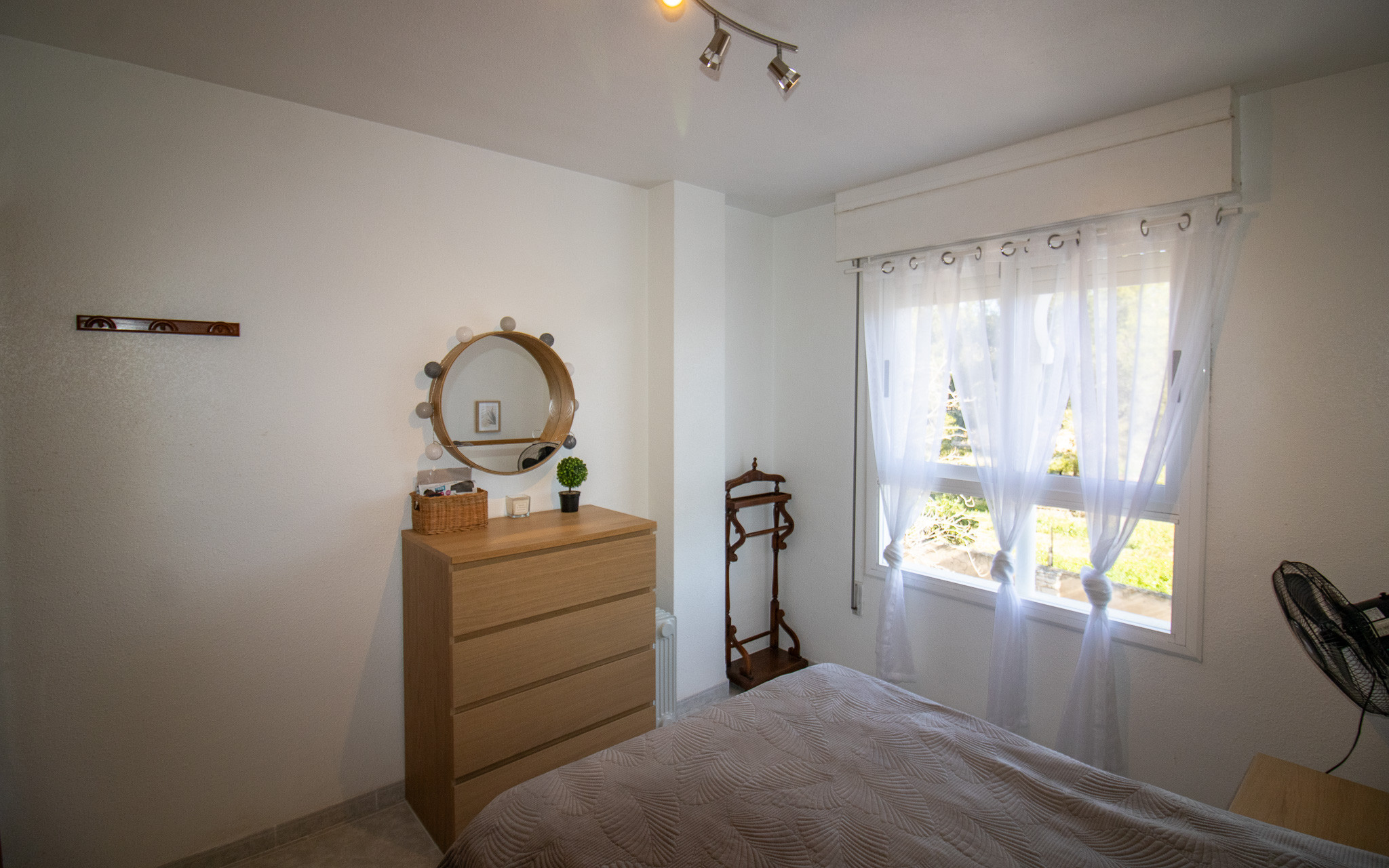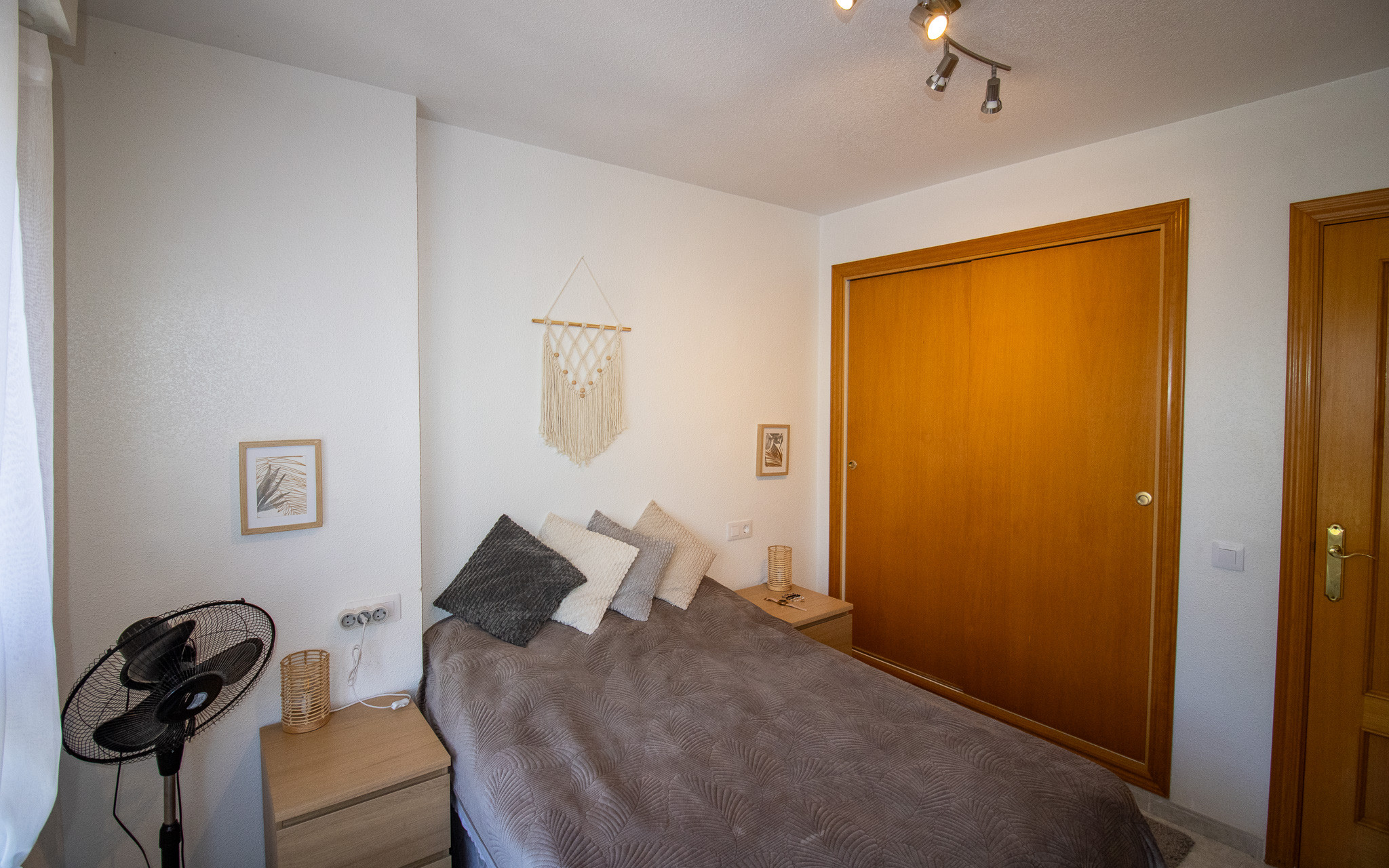 El dormitorio tiene una cama de matrimonio , así como un ventilador de techo y un armario empotrado .