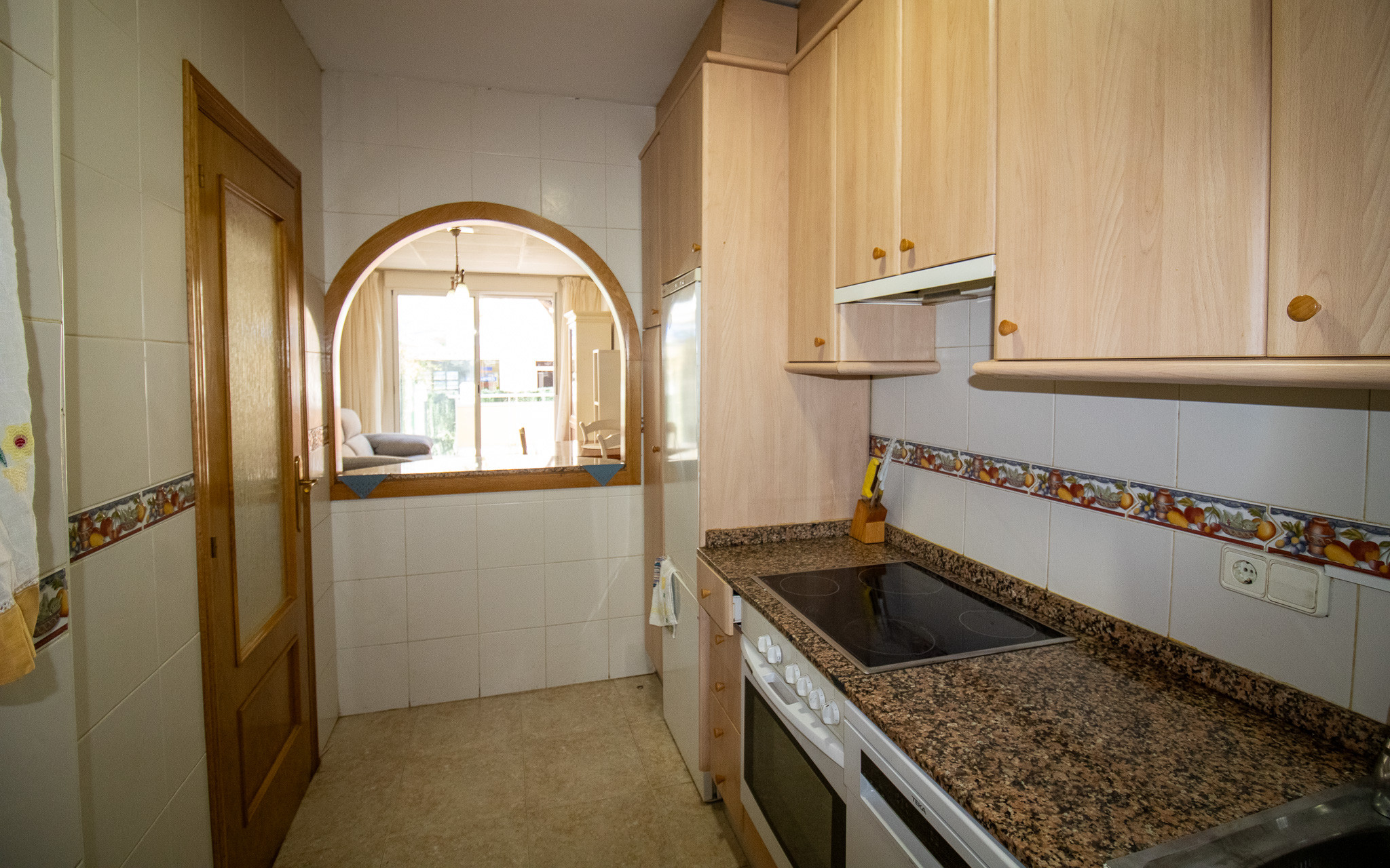 Precioso apartamento en alquiler en Habitat, en primera línea de la playa Romana . El apartamento, en primera planta, está recién reformado, amueblado y decorado con mucho gusto. Además, el espacio está inteligentemente optimizado, gracias a elementos como el sofá-cama chaise longue, o la litera plegable.