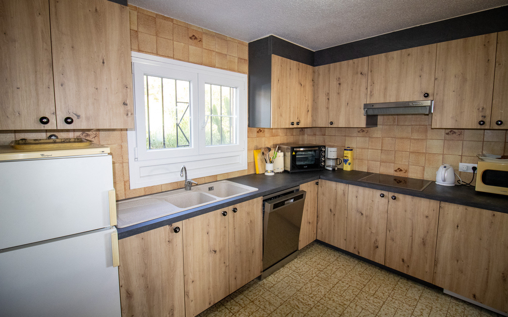 Die Offene Küche mit Ceranfeld ist ausgestattet in einen Kühlschrank, eine Mikrowelle, ein Backofen, Gefrierschrank, eine Spülmaschine, Geschirr/Besteck, Kochutensilien, eine Kaffeemaschine und einen Toaster.