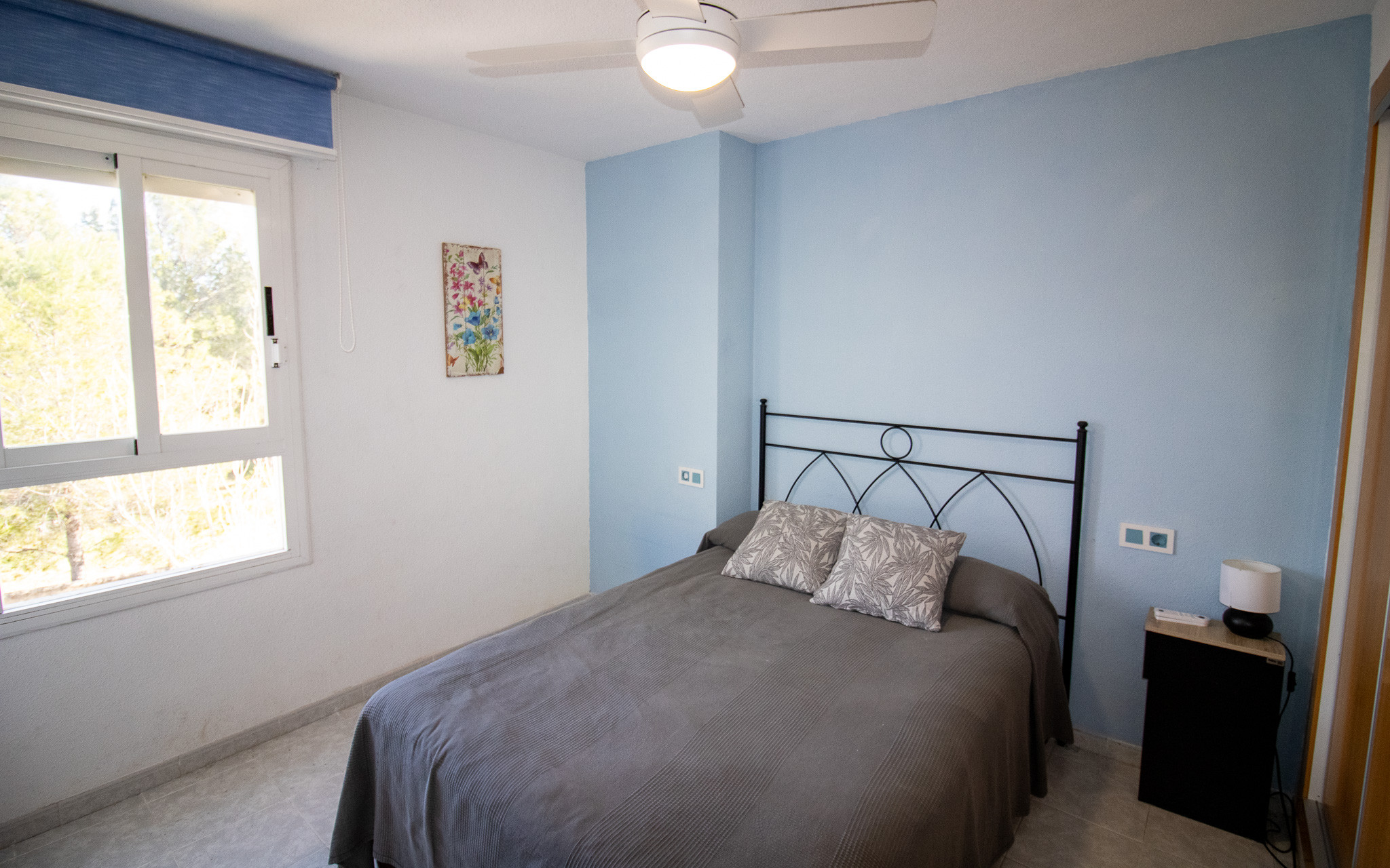 Das Schlafzimmer hat ein Doppelbett, sowie einen Deckenventilator und einen Einbauschrank.