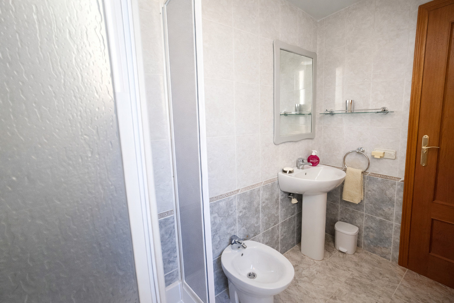 Das Badezimmer hat eine begehbare Dusche.