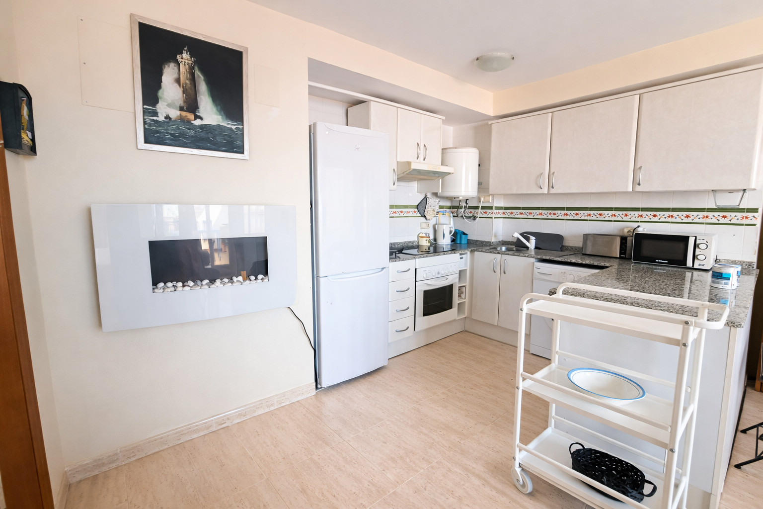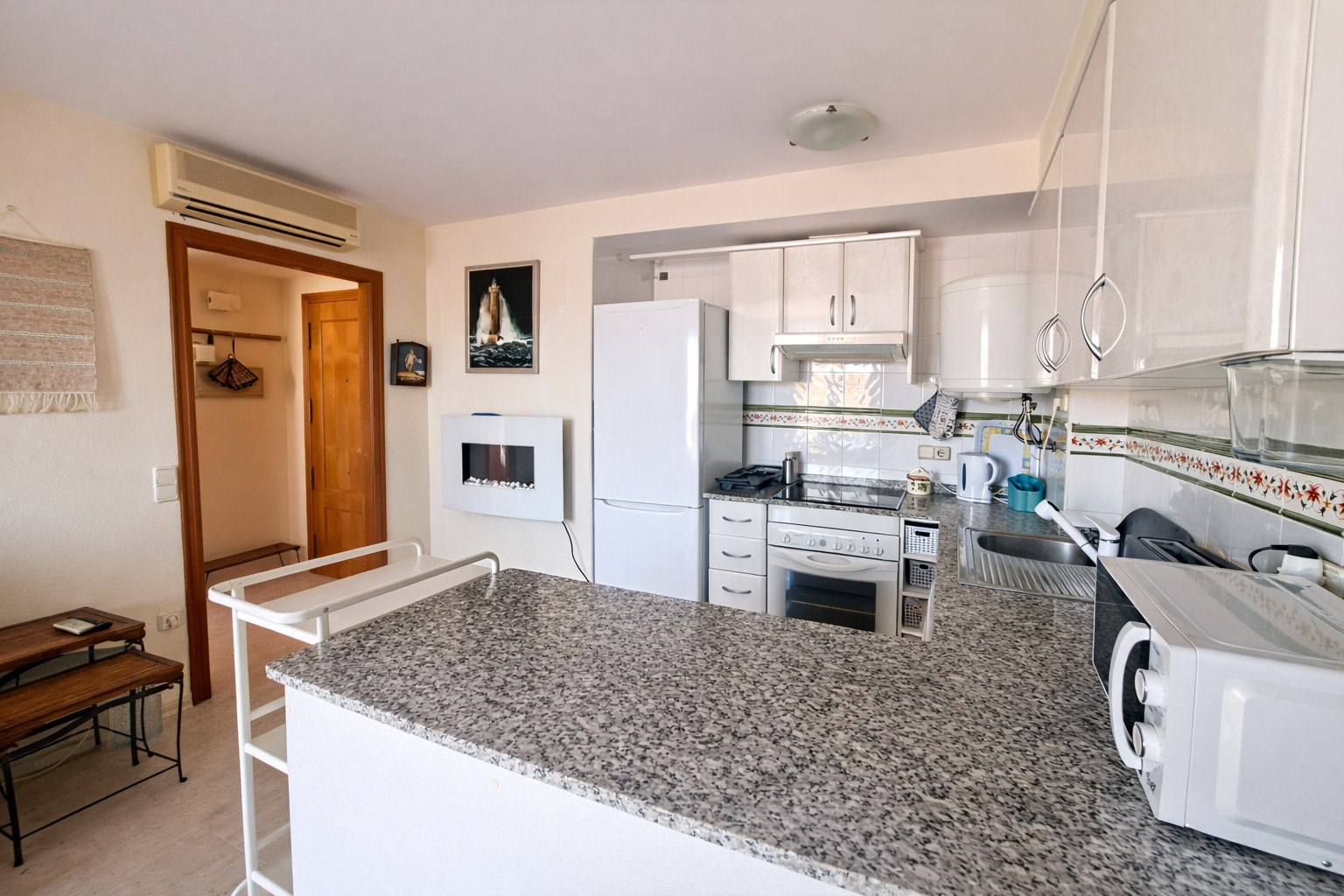 Die offene Küche ist mit Kühlschrank, Mikrowelle, Backofen, Gefrierschrank, Waschmaschine, Kochutensilien, Kaffeemaschine und Toaster ausgestattet.