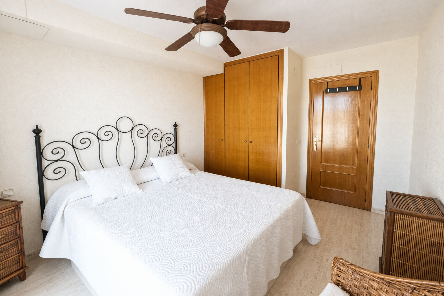 Das Schlafzimmer hat ein Doppelbett, sowie einen Deckenventilator und einen Einbauschrank.
