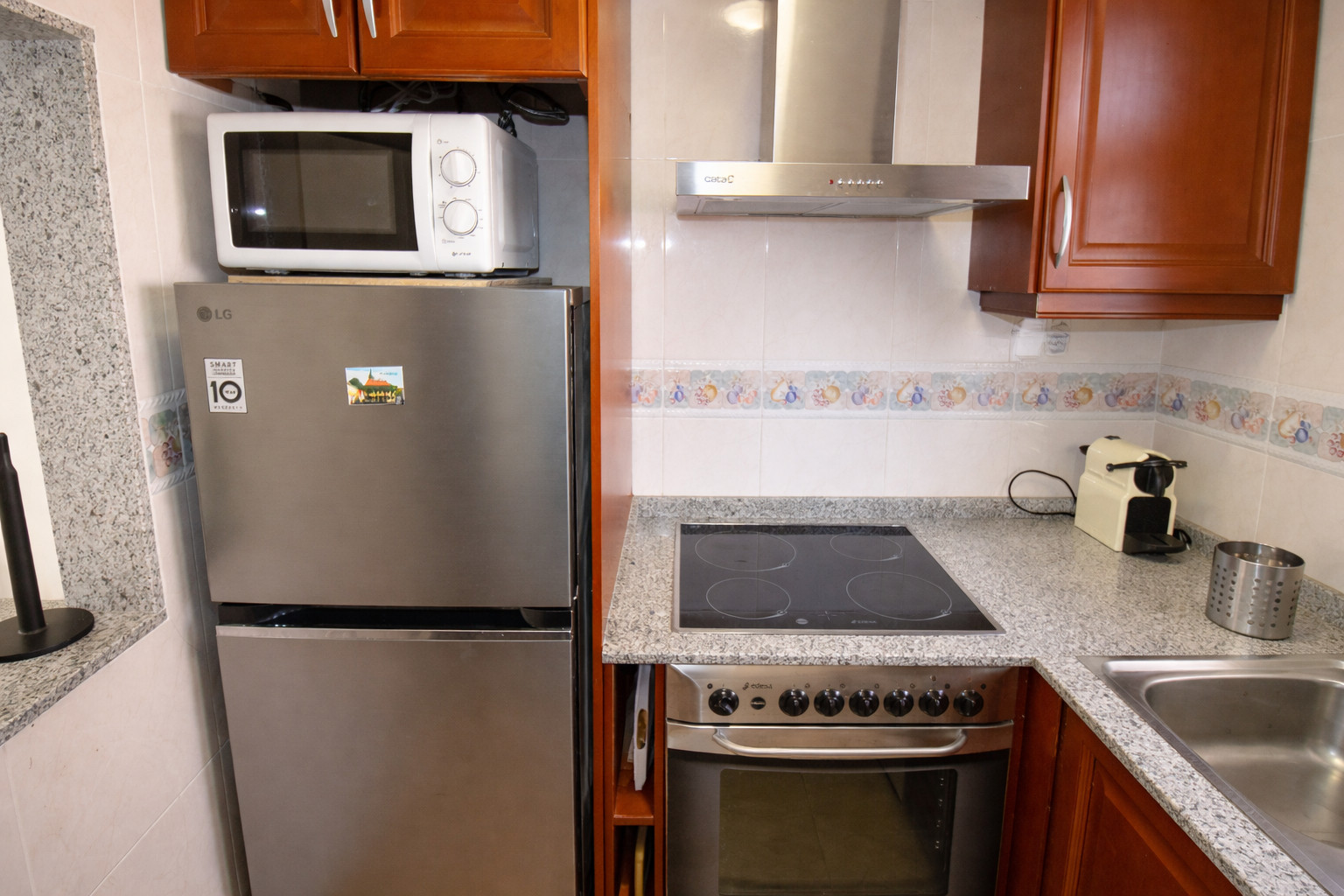 Es hat 1 Schlafzimmer mit zwei Einzelbetten, ein Schlafsofa und ein Etagenbett (das Etagenbett steht im Flur). Die maximale Kapazität ist also 6. *Nur für Erwachsene, empfohlen für maximal 4 Personen*. Es hat ein Badezimmer mit Dusche. Die Küchenzeile verfügt über ein Cerankochfeld, eine Mikrowelle, eine Waschmaschine sowie verschiedene Utensilien und grundlegende Dinge wie Kaffeemaschine und Toaster.