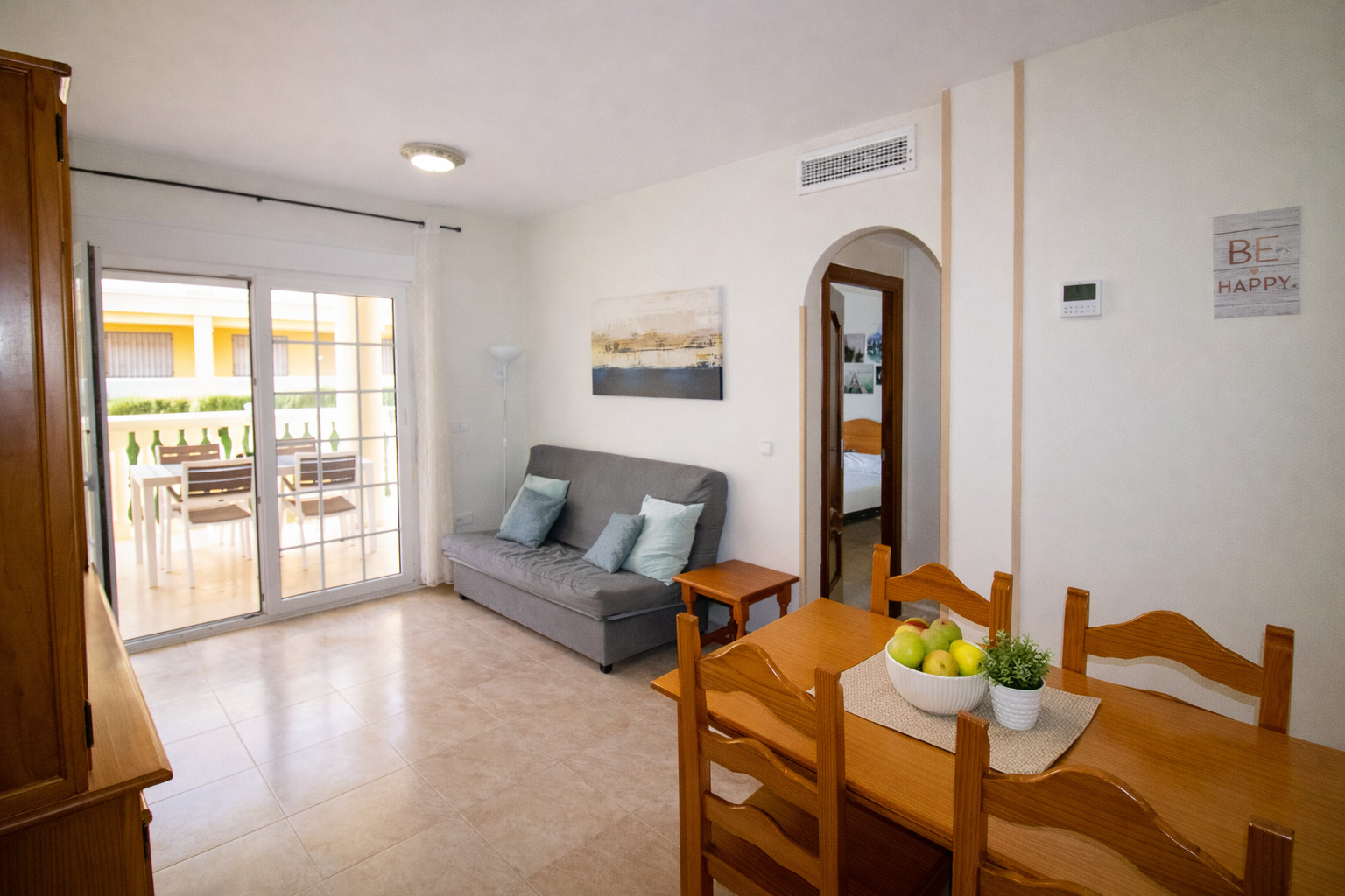 Schöne Wohnung zu vermieten in Habitat, in der ersten Linie des Strandes von Romana. Die Wohnung im ersten Stock ist neu renoviert, möbliert und geschmackvoll eingerichtet. Außerdem wird der Raum durch Elemente wie das Chaiselongue-Sofa oder das ausklappbare Etagenbett geschickt optimiert.