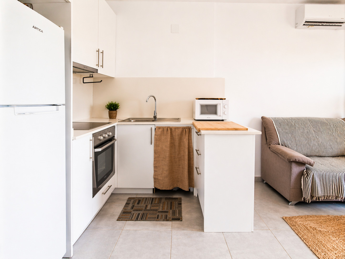 Die Offene Küche mit Ceranfeld ist ausgestattet in einen Kühlschrank, eine Mikrowelle, ein Backofen, Gefrierschrank, Geschirr/Besteck, Kochutensilien, eine Kaffeemaschine und einen Toaster.
