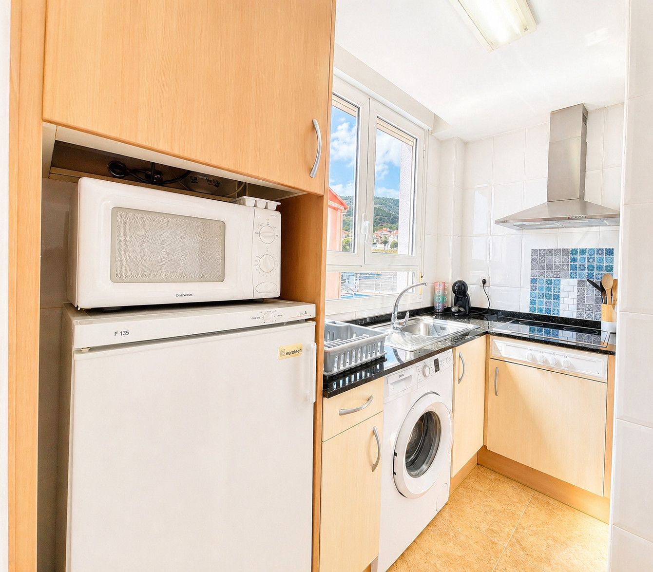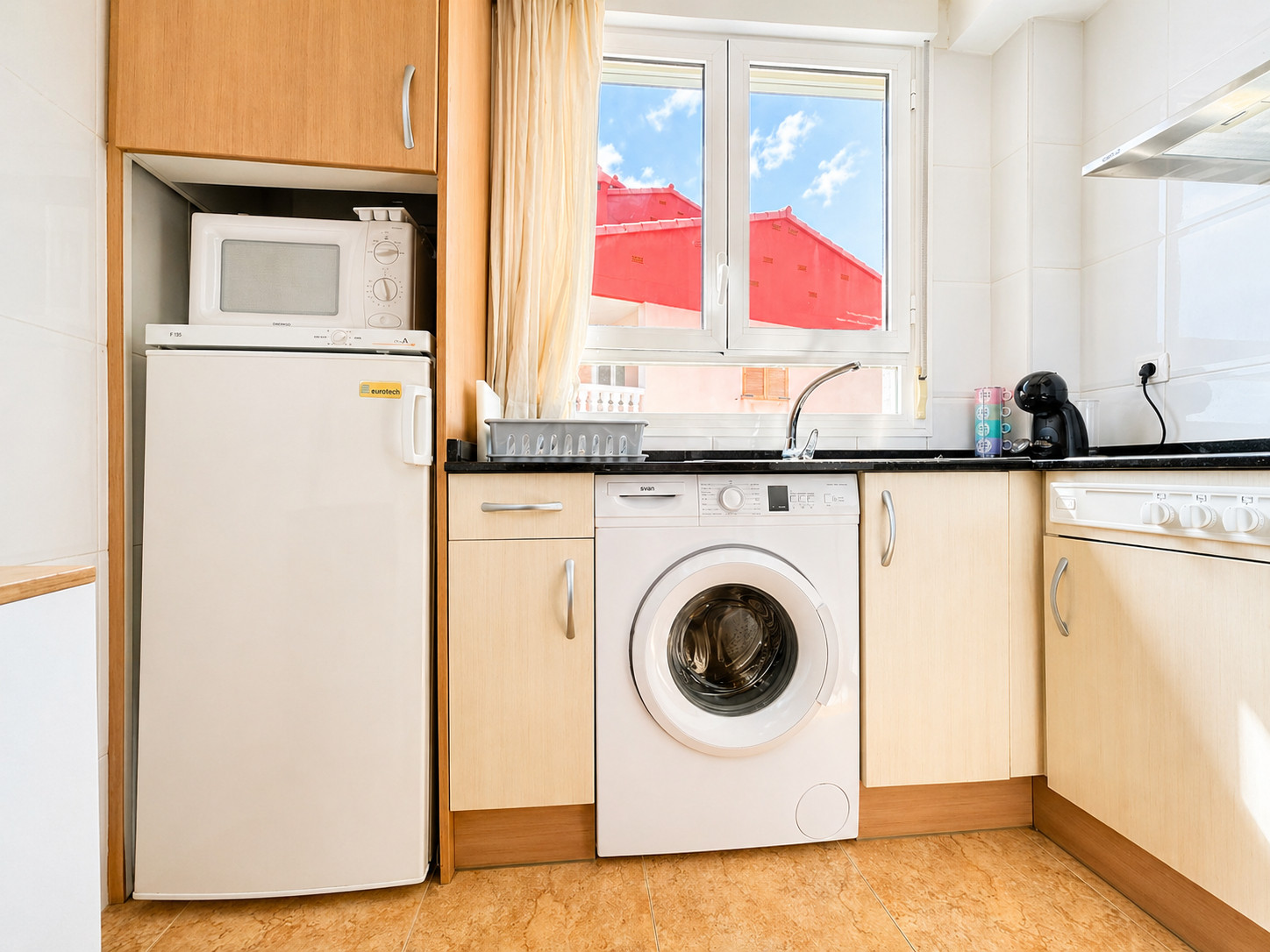 Die Küche ist im amerikanischen Stil gehalten und mit Backofen, Waschmaschine, Kühlschrank mit Gefrierfach, Toaster, Kaffeemaschine und allen grundlegenden Küchenutensilien ausgestattet.