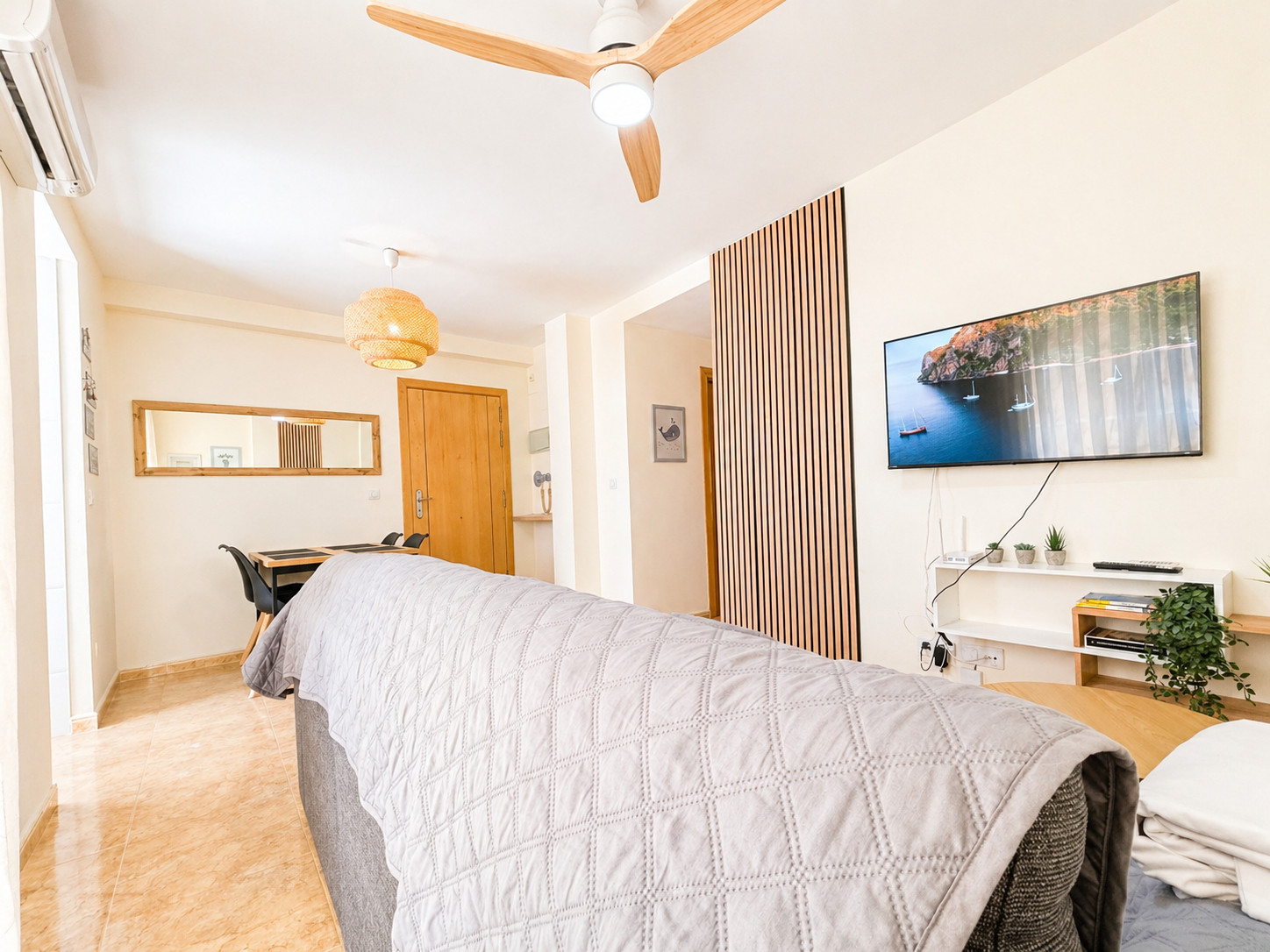 Ein Schlafzimmer mit Doppelbett und Einbauschrank. Ein Etagenbett im Flur. Ein Wohn-Esszimmer mit Doppelschlafcouch und TV.