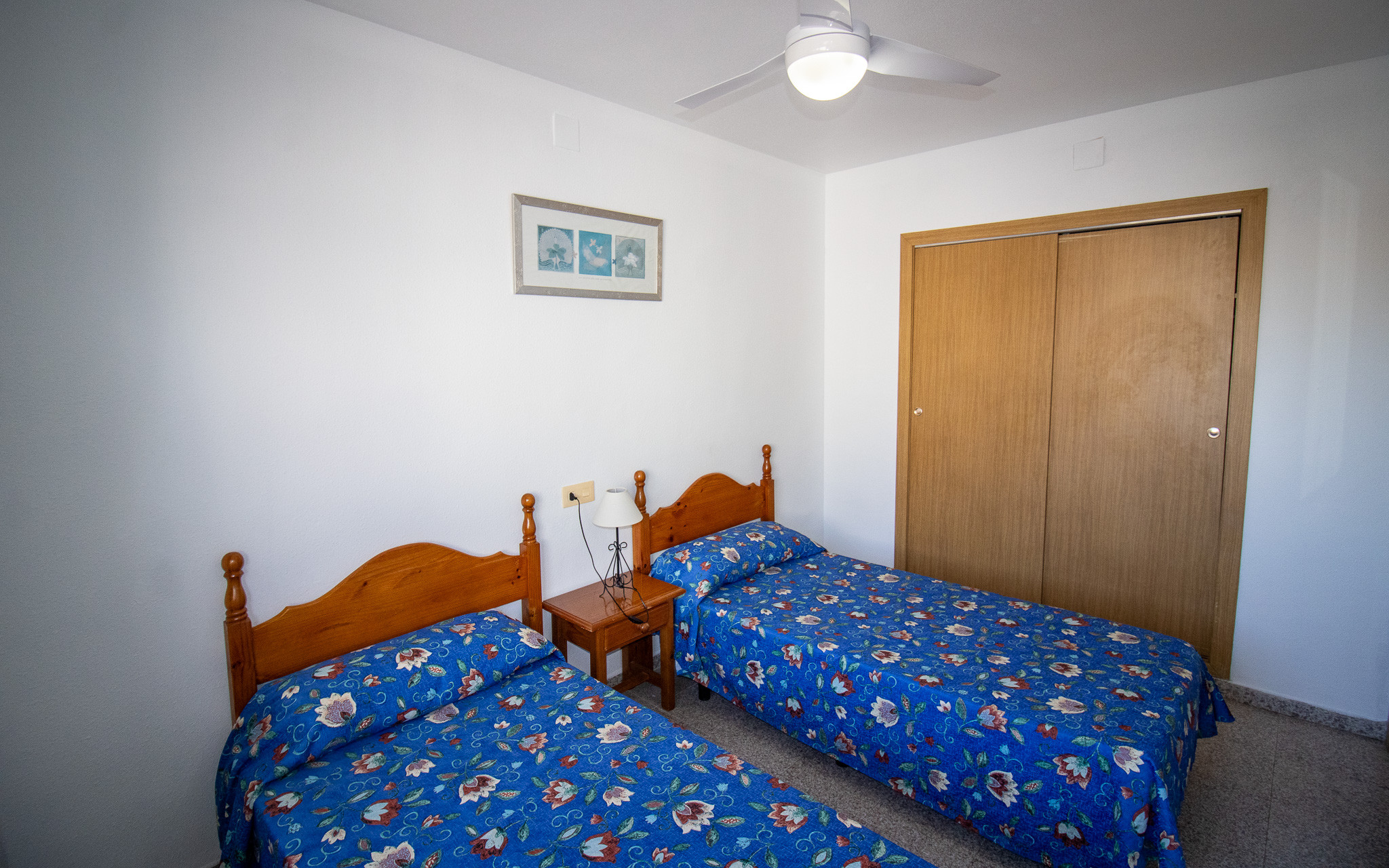 Zwei Schlafzimmer. Das erste, mit einem Doppelbett und Einbauschrank. Das zweite, mit einem Etagenbett. Ein Badezimmer mit Badewanne.