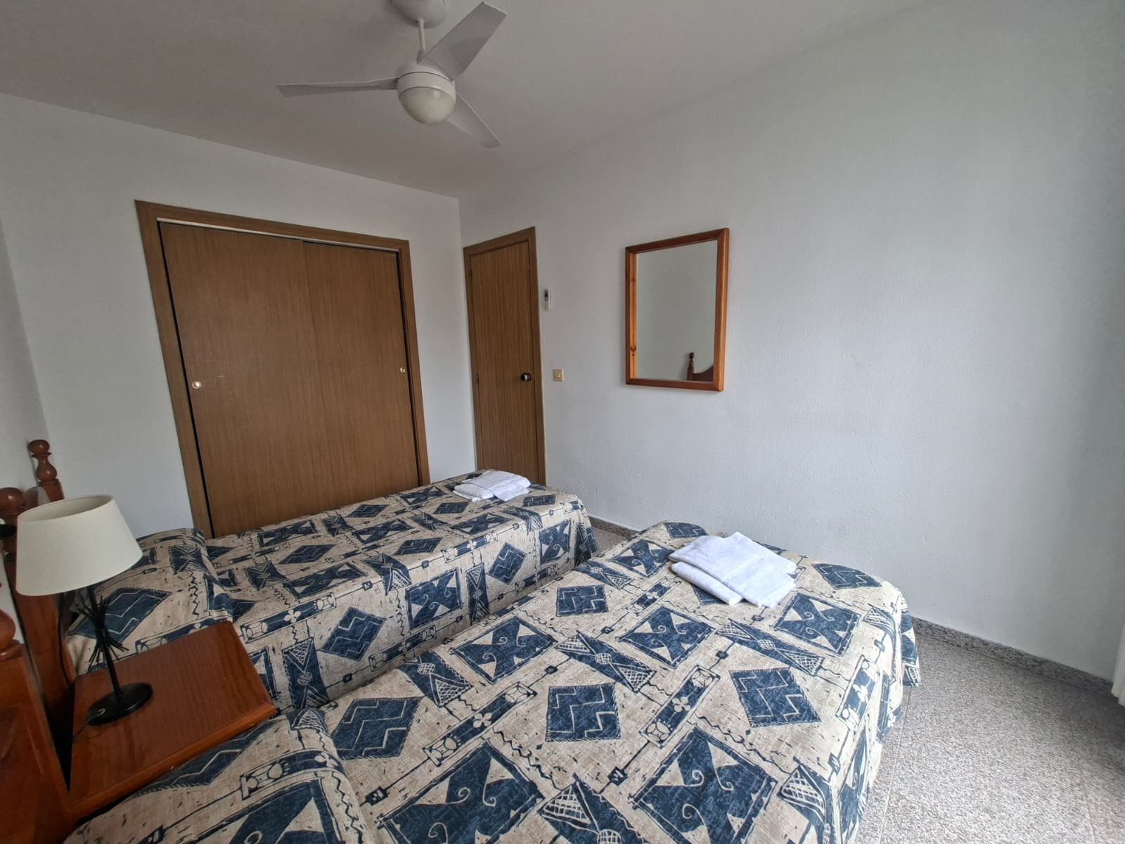 Zwei Schlafzimmer. Das erste, mit einem Doppelbett und Einbauschrank. Das zweite, mit einem Etagenbett. Ein Badezimmer mit Badewanne.