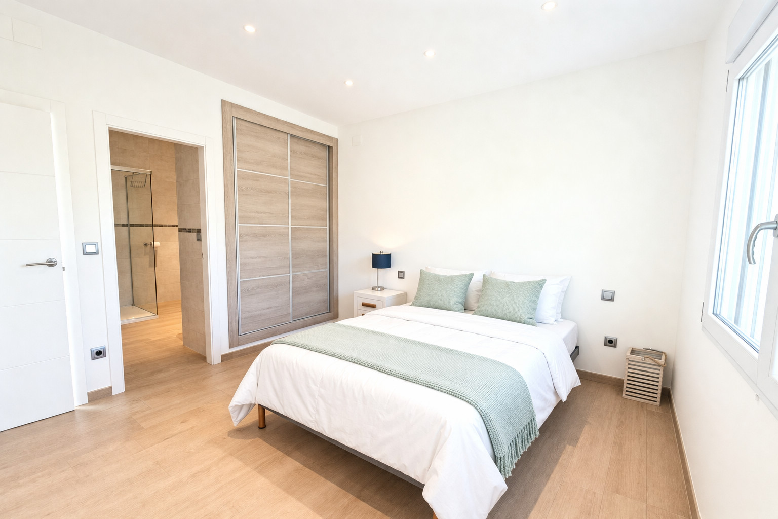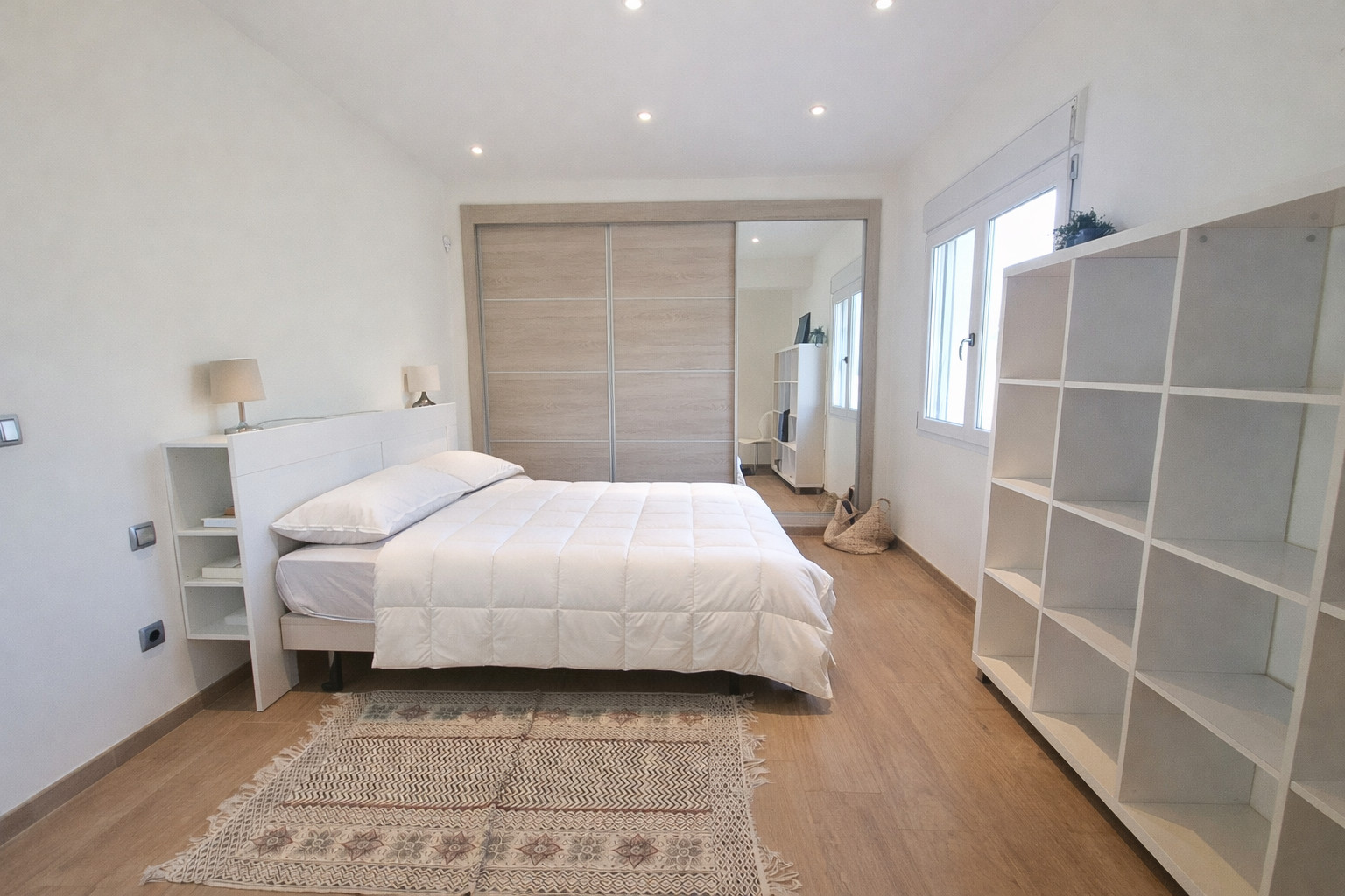 The first bedroom, with double bed, air conditioning, fitted wardrobe and private balcony.