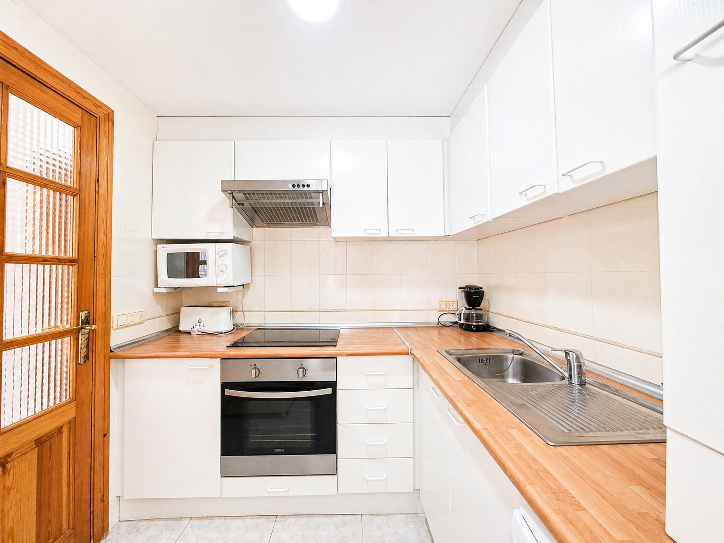Une cuisine séparée, plaque vitrocéramique, équipée d'un réfrigérateur, d'un micro-ondes, d'un four, d'un congélateur, d'un lave-linge, de la vaisselle, des ustensiles de cuisine et d'une machine à café.