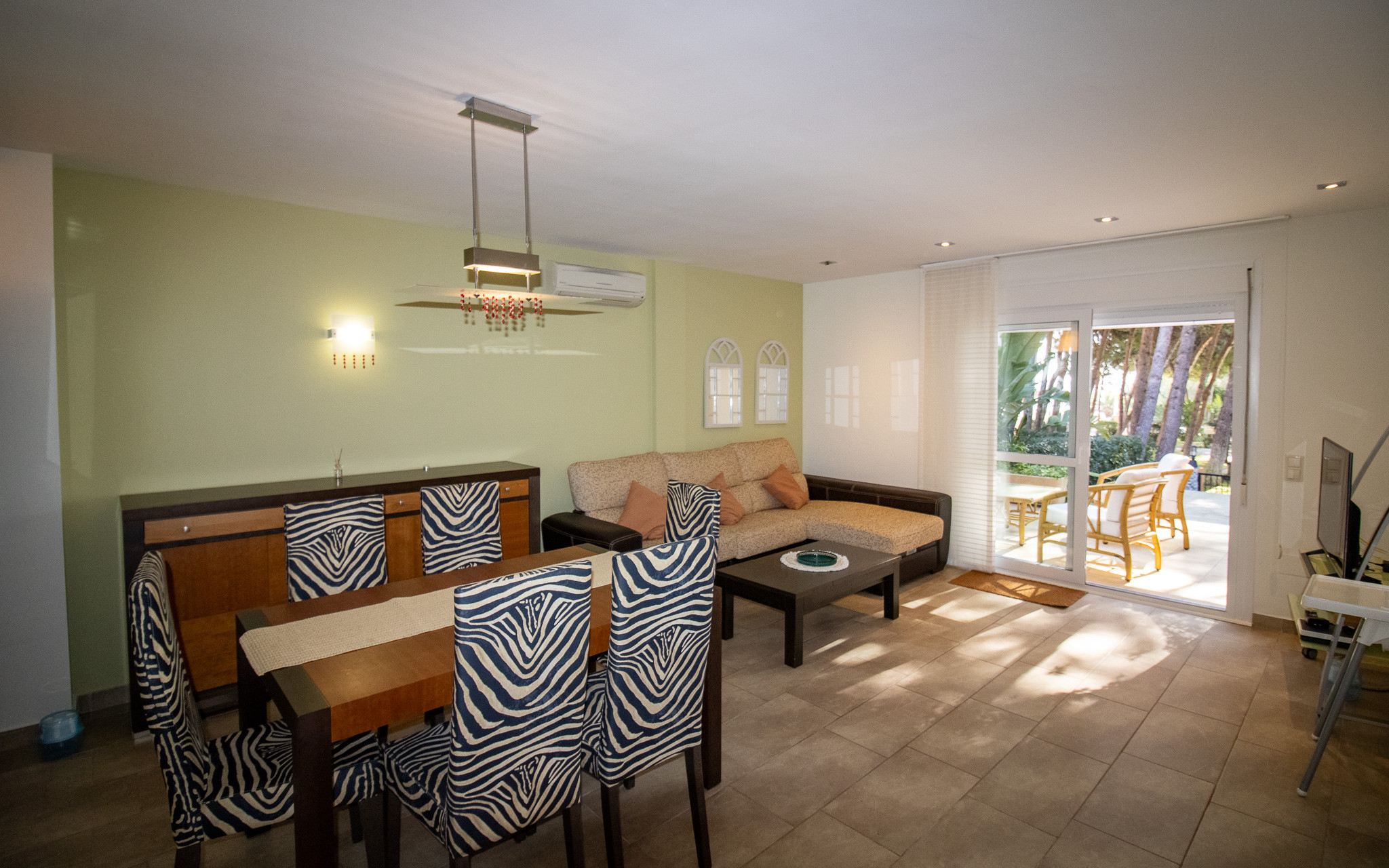 Elle dispose de mobilier de jardin, terrasse, lave-linge, accès internet (wifi), chauffage pompe à chaleur, climatisation dans tout le logement, piscine collective+infantile, garage même bâtiment, 1 Télévision.