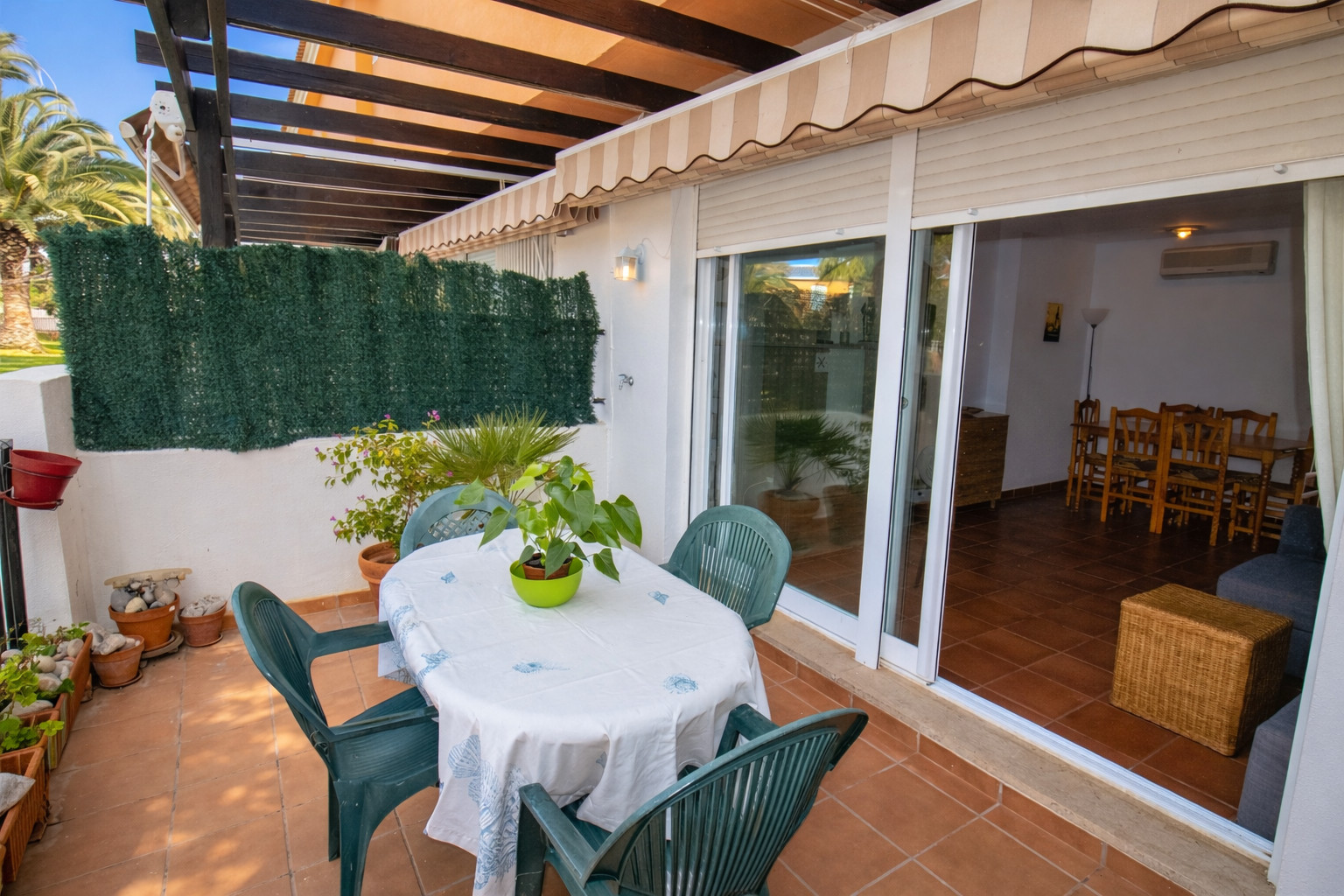 La terrasse est spacieuse et fraîche, avec un auvent qui vous permet d'être tranquille même aux heures les plus chaudes, grâce aussi à l'orientation de la terrasse.