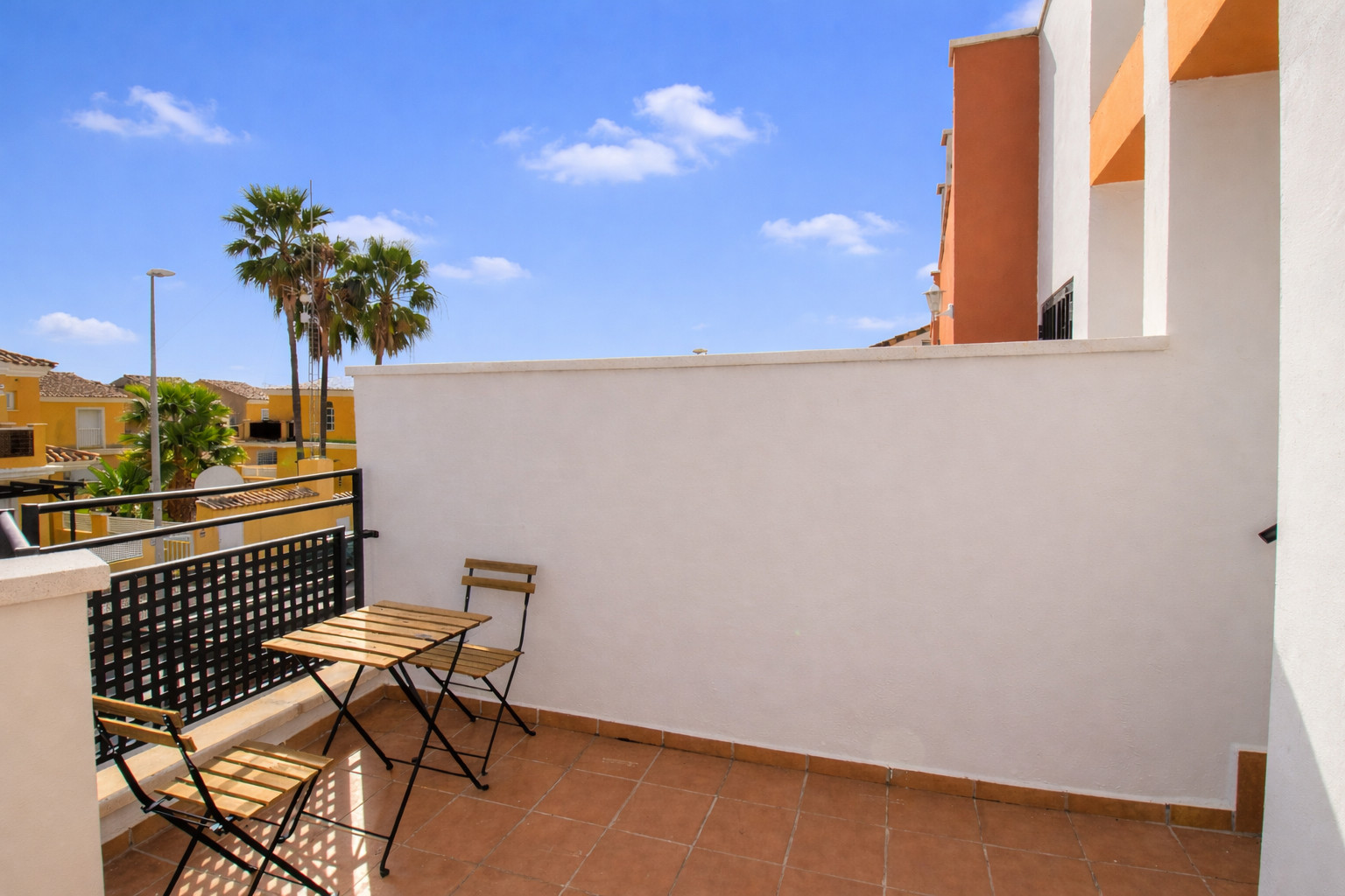 À l'étage supérieur, nous trouvons les deux chambres à coucher. L'une d'entre elles possède sa propre terrasse. Ainsi qu'une deuxième salle de bain rénovée avec douche.